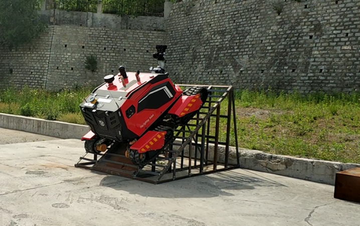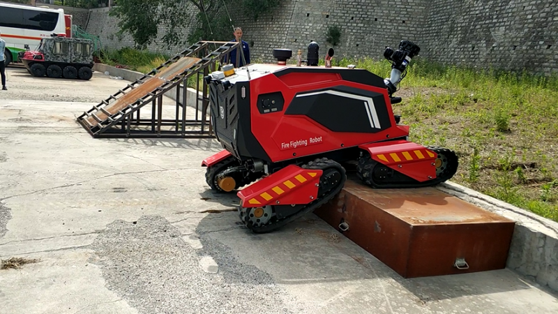 在驗收現(xiàn)場,根據(jù)山東消防救援總隊提出的驗收標(biāo)準,與同行競品分別進行了垂直越障、S型行走、45度爬坡、單邊橋行進、拖拉水帶行走、射水距離、夜間盲操等性能測試。